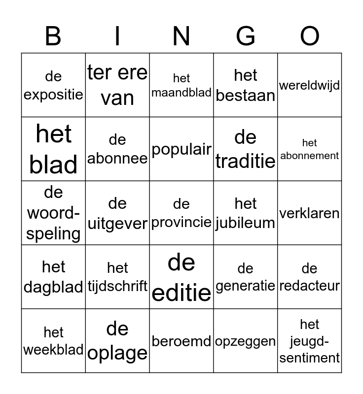 This bingo card has a free space and 24 words: het tijdschrift, de oplage, populair, het weekblad, wereldwijd, de expositie, het blad, ter ere van, het jubileum, de editie, de traditie, de woord- speling, de generatie, de redacteur, de abonnee, opzeggen, verklaren, het maandblad, het abonnement, de uitgever, het jeugd- sentiment, het dagblad, het bestaan and beroemd.