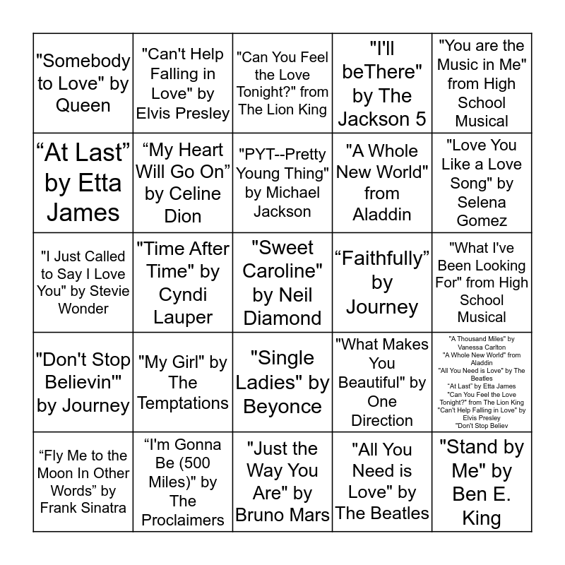 This bingo card has 28 words: "A Thousand Miles" by Vanessa Carlton "A Whole New World" from Aladdin "All You Need is Love" by The Beatles “At Last” by Etta James "Can You Feel the Love Tonight?" from The Lion King "Can't Help Falling in Love" by Elvis Presley "Don't Stop Believ, "A Thousand Miles" by Vanessa Carlton, "A Whole New World" from Aladdin, "All You Need is Love" by The Beatles, “At Last” by Etta James, "Can You Feel the Love Tonight?" from The Lion King, "Can't Help Falling in Love" by Elvis Presley, "Don't Stop Believin'" by Journey, “Faithfully” by Journey, “Fly Me to the Moon In Other Words” by Frank Sinatra, "I Just Called to Say I Love You" by Stevie Wonder, "I'll beThere" by The Jackson 5, “I'm Gonna Be (500 Miles)" by The Proclaimers, "Just the Way You Are" by Bruno Mars, "Love You Like a Love Song" by Selena Gomez, "L-O-V-E" by Nat King Cole, "My Girl" by The Temptations, “My Heart Will Go On” by Celine Dion, "PYT--Pretty Young Thing" by Michael Jackson, "Single Ladies" by Beyonce, "Somebody to Love" by Queen, "Stand by Me" by Ben E. King, "Sweet Caroline" by Neil Diamond, "Time After Time" by Cyndi Lauper, "What I've Been Looking For" from High School Musical, "What Makes You Beautiful" by One Direction, "You are the Music in Me" from High School Musical and “Your Song” by Elton John.