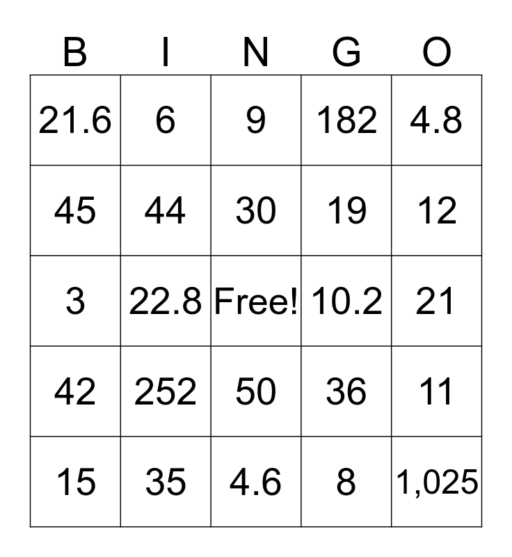This bingo card has a free space and 24 words: 252, 35, 30, 15, 4.8, 21.6, 45, 6, 10.2, 50, 19, 3, 36, 11, 44, 8, 21, 9, 12, 22.8, 1,025, 42, 182 and 4.6.