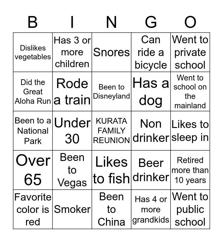 This bingo card has a free space and 24 words: Been to Vegas, Smoker, Been to Disneyland, Favorite color is red, Went to private school, Dislikes vegetables, Did the Great Aloha Run, Has 3 or more children, Non drinker, Likes to fish, Has a dog, Been to a National Park, Beer drinker, Retired more than 10 years, Rode a train, Has 4 or more grandkids, Likes to sleep in, Snores, Went to school on the mainland, Under 30, Went to public school, Over 65, Can ride a bicycle and Been to China.