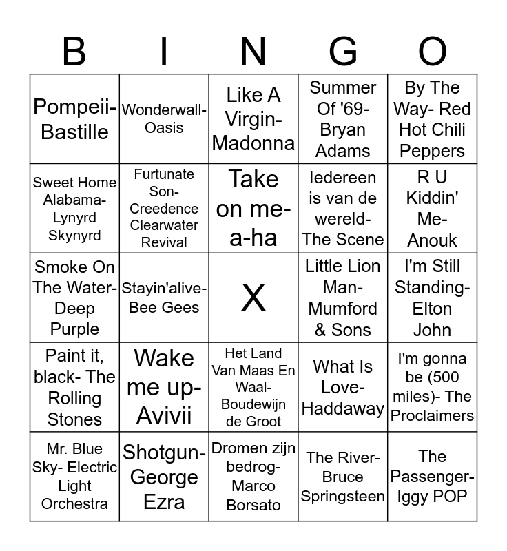 This bingo card has a free space and 43 words: Africa- TOTO, Stayin'alive- Bee Gees, Sammy- Ramses Shaffy, Bohemian Rhapsody- Queen, Viva La Vida- Coldplay, Mr. Blue Sky- Electric Light Orchestra, Wonderwall-Oasis, Saturday Night- Herman Brood, Iedereen is van de wereld- The Scene, I'm gonna be (500 miles)- The Proclaimers, Sweet Home Alabama- Lynyrd Skynyrd, Wake me up- Avivii, Dromen zijn bedrog- Marco Borsato, The River- Bruce Springsteen, Go Your Own Way- Fleetwood Mac, Paint it, black- The Rolling Stones, Rolling in the deep- Adele, Take on me- a-ha, Bloed, Zweet en Tranen- André Hazes, R U Kiddin' Me- Anouk, Pompeii- Bastille, Three Little Birds- Bob Marley, Het Land Van Maas En Waal- Boudewijn de Groot, Summer Of '69- Bryan Adams, Girls Just Want To have fun- Cyndi Lauper, Smoke On The Water- Deep Purple, Come On Eileen- Dexys Midnight Runners, Smoorverliefd- Doe Maar, Shape Of You- Ed Sheeran, I'm Still Standing- Elton John, Blue Suede Shoes- Eltvis Presley, Shotgun- George Ezra, L'Amour Toujours- Gigi D'Agostino, What Is Love- Haddaway, The Passenger- Iggy POP, On Top Of The World- Imagine Dragons, Ring Of Fire- Johnny Cash, Like A Virgin- Madonna, Little Lion Man- Mumford & Sons, By The Way- Red Hot Chili Peppers, Song 2- Blur, Furtunate Son- Creedence Clearwater Revival and Eleanor Rigby- The Beatles.