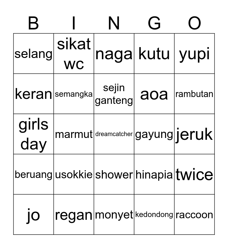 This bingo card has a free space and 24 words: usokkie, regan, sejin ganteng, jo, yupi, selang, keran, sikat wc, gayung, shower, aoa, girls day, hinapia, twice, semangka, kedondong, jeruk, naga, rambutan, marmut, raccoon, beruang, kutu and monyet.