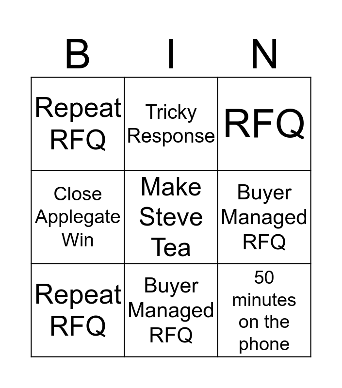 This bingo card has a free space and 8 words: Buyer Managed RFQ, RFQ, Tricky Response, Repeat RFQ, Repeat RFQ, 50 minutes on the phone, Close Applegate Win and Buyer Managed RFQ.