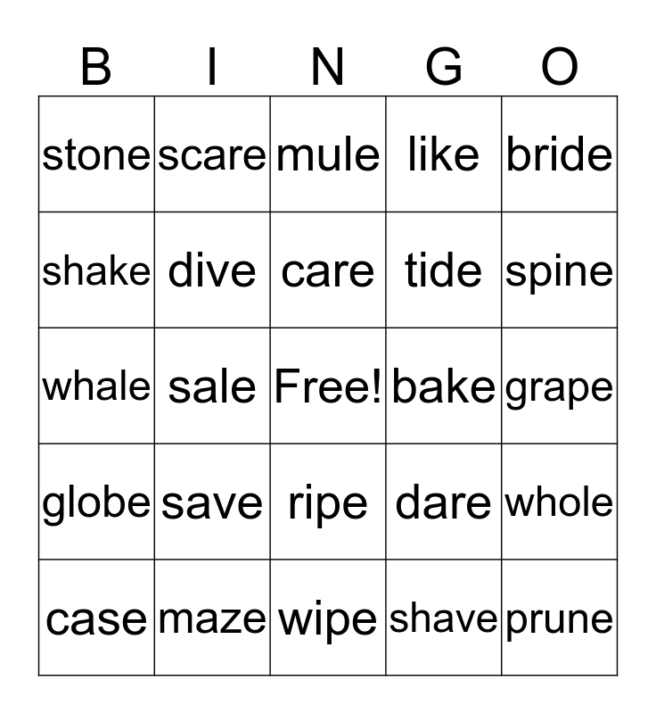 This bingo card has a free space and 24 words: save, maze, care, case, bride, stone, shake, scare, bake, ripe, tide, whale, dare, whole, dive, shave, grape, mule, spine, sale, prune, globe, like and wipe.