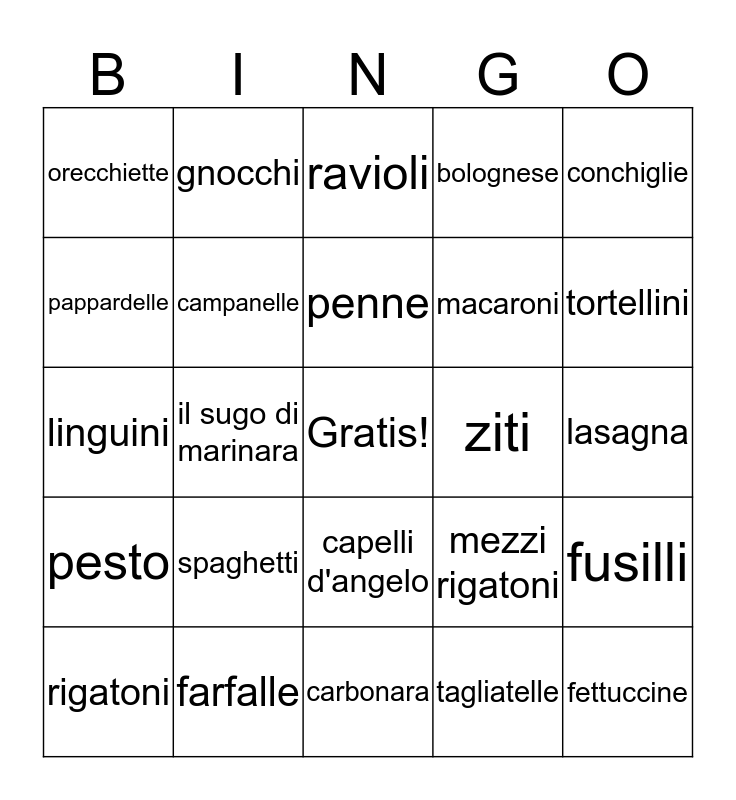 This bingo card has a free space and 24 words: spaghetti, farfalle, penne, rigatoni, conchiglie, orecchiette, pappardelle, gnocchi, ziti, capelli d'angelo, macaroni, linguini, mezzi rigatoni, fusilli, campanelle, tagliatelle, lasagna, ravioli, tortellini, il sugo di marinara, fettuccine, pesto, bolognese and carbonara.