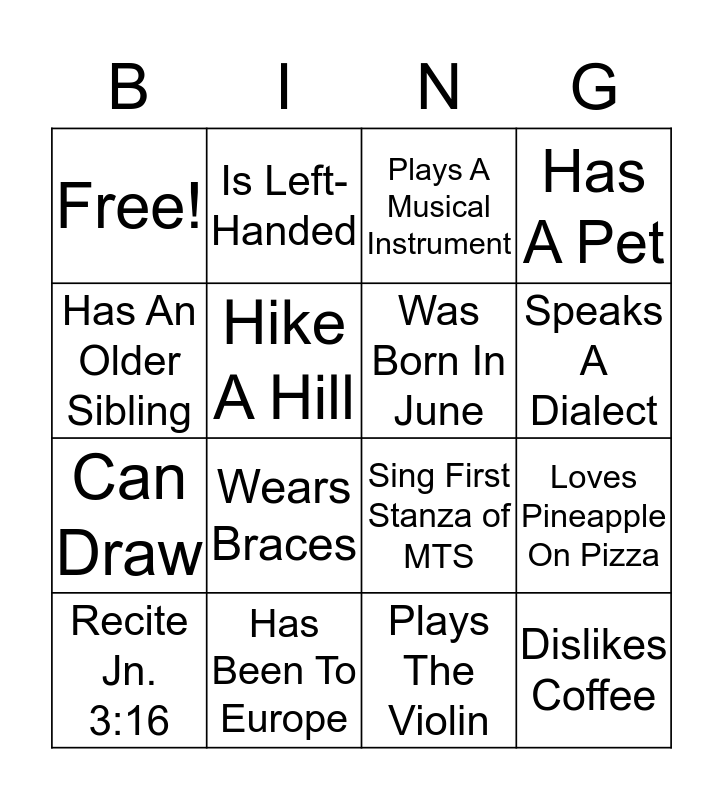 This bingo card has 16 words: Recite Jn. 3:16, Has Been To Europe, Plays A Musical Instrument, Has A Pet, Has An Older Sibling, Is Left-Handed, Sing First Stanza of MTS, Loves Pineapple On Pizza, Free!, Hike A Hill, Plays The Violin, Speaks A Dialect, Can Draw, Wears Braces, Was Born In June and Dislikes Coffee.