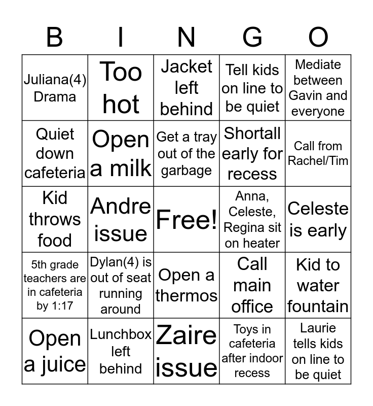 This bingo card has a free space and 39 words: Tell Amari to walk, Nikolai is running around, Peel an orange, Open a milk, Open a juice, Open a thermos, Get a tray out of the garbage, Get a hug from William, Mediate between Gavin and everyone, 5th grade teachers are in cafeteria by 1:17, Andre issue, Tell kids on line to be quiet, Laurie tells kids on line to be quiet, Celeste is early, Anna, Celeste, Regina sit on heater, Dylan(4) is out of seat running around, Dylan(5) is running around, Juliana(4) Drama, Call custodian, Call main office, Quiet down cafeteria, Zaire issue, Shortall early for recess, Call from Rachel/Tim, Sick kid, Early pick-up, Drama, Crying (Adult or kid), Buy a lunch, Too hot, Clean a spill, Clean a lunchbox, Jacket left behind, Lunchbox left behind, Toys in cafeteria after indoor recess, Kid to bathroom, Kid to water fountain, Kid throws food and Kid stays behind to finish snack.
