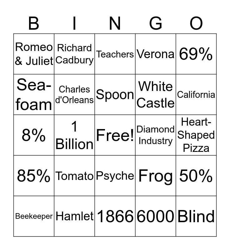 This bingo card has a free space and 33 words: Lupercalia, Herself, 1 Billion, Venus, 85%, Charles d'Orleans, 69%, Beekeeper, Richard Cadbury, Hugs, Spoon, Teachers, Cockroach, 10, Diamond Industry, California, Hamlet, 8%, Tomato, Frog, Psyche, 4, Romeo & Juliet, Heart-Shaped Pizza, 1866, Blind, Verona, White Castle, Sea-foam, 50%, Dolphin, 6000 and Rabbi.