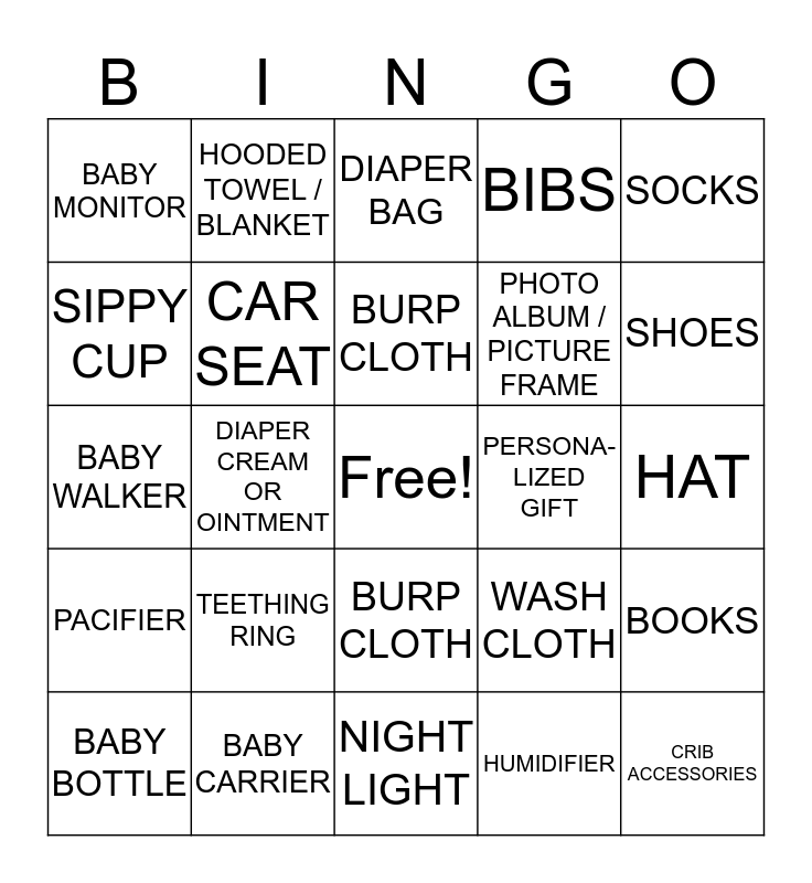 This bingo card has a free space and 34 words: HIGH CHAIR, HUMIDIFIER, STROLLER, TOY, PACIFIER, CAR SEAT, SOCKS, BABY BOTTLE, HOODED TOWEL / BLANKET, DIAPER CHANGING PAD, BURP CLOTH, DIAPER BAG, RATTLE, BOTTLE WARMER, PERSONA-LIZED GIFT, SHOES, BABY CARRIER, BABY WALKER, TEETHING RING, WASH CLOTH, BURP CLOTH, BREASTFEEDING SUPPLIES, BABY MONITOR, HAT, NIGHT LIGHT, CRIB ACCESSORIES, BIBS, NAIL CLIPPERS, PHOTO ALBUM / PICTURE FRAME, SIPPY CUP, ONESIE, DIAPER CREAM OR OINTMENT, BOOKS and WIPES / WIPES DISPENSER.