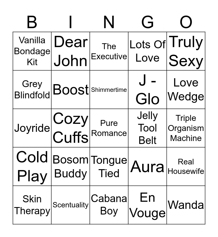 This bingo card has a free space and 24 words: Bosom Buddy, Scentuality, Shimmertime, Skin Therapy, Truly Sexy, Vanilla Bondage Kit, Grey Blindfold, Dear John, Jelly Tool Belt, Tongue Tied, J - Glo, Joyride, Aura, Real Housewife, Boost, En Vouge, Triple Organism Machine, The Executive, Love Wedge, Cozy Cuffs, Wanda, Cold Play, Lots Of Love and Cabana Boy.