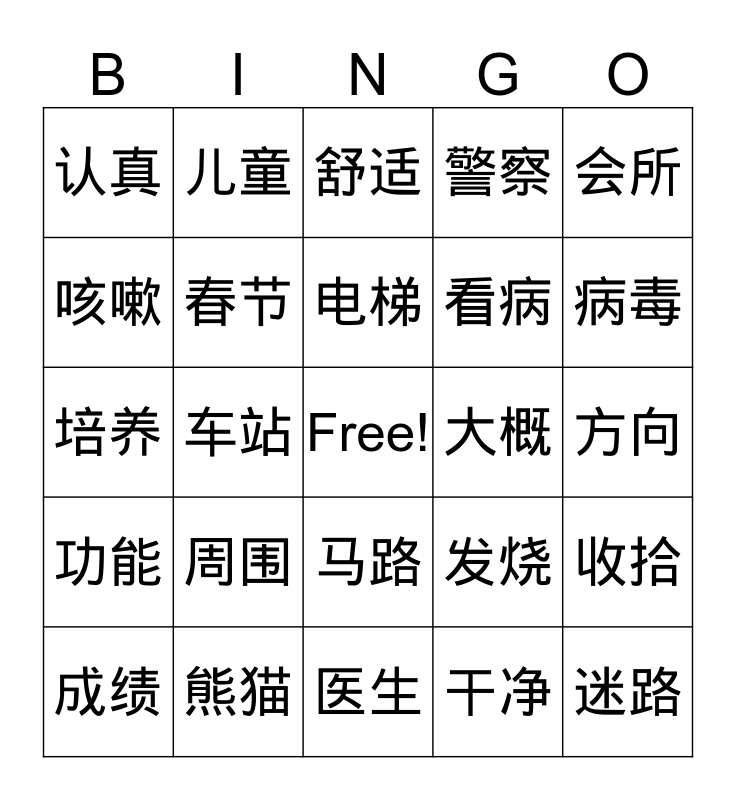 This bingo card has a free space and 39 words: 努力, 学校, 考试, 春节, 成绩, 马路, 电梯, 天桥, 会所, 功能, 车站, 警察, 迷路, 方向, 大概, 周围, 生活, 认真, 需要, 发烧, 咳嗽, 医生, 看病, 病毒, 生气, 开心, 邮局, 菜场, 环境, 儿童, 优美, 工具, 舒适, 熊猫, 干净, 简单, 收拾, 培养 and 关心.