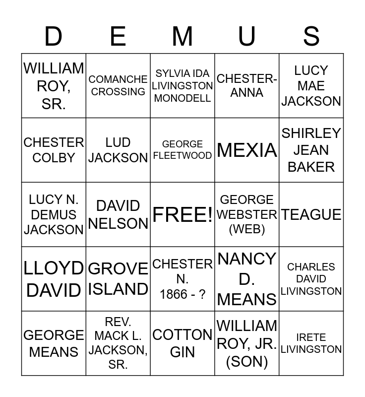 This bingo card has a free space and 35 words: NICHOLAS 1843- 1897, BETTIE MEANS ? - 1871, LUD N. 1865 - ?, LUD JACKSON, CHESTER N. 1866 - ?, CHESTER-ANNA, CHESTER COLBY, FLEETWOOD N., GEORGE FLEETWOOD, FLEETWOOD JACKSON, LUCY N. DEMUS JACKSON, LUCY MAE JACKSON, NICK JACKSON, GEORGE NICHOLAS, WILLIAM ROY, SR., GEORGE WEBSTER (WEB), WILLIAM ROY, JR. (SON), DAVID NELSON, LLOYD DAVID, IRETE LIVINGSTON, NANCY D. MEANS, GEORGE MEANS, CHARLES DAVID LIVINGSTON, REV. MACK L. JACKSON, SR., SYLVIA IDA LIVINGSTON MONODELL, SHIRLEY JEAN BAKER, SYLVIE ABERNATHY, UNION PRIMITIVE BAPTIST, MEXIA, TEAGUE, FURNEY RICHARDSON, COTTON GIN, GROVE ISLAND, COMANCHE CROSSING and ODDFELLOW GROUNDS.