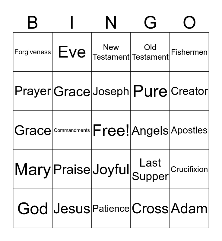 This bingo card has a free space and 29 words: God, Love, Commandments, Parables, Forgiveness, New Testament, Grace, Praise, Angels, Jesus, Apostles, Adam, Patience, Cross, Creator, Anointed, Joyful, Mary, Fishermen, Grace, Last Supper, David, Pure, Prayer, Old Testament, Eve, Crucifixion, Joseph and Goliath.