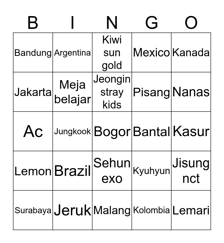 This bingo card has a free space and 24 words: Brazil, Jeruk, Jeongin stray kids, Surabaya, Kanada, Bandung, Jakarta, Argentina, Bantal, Sehun exo, Pisang, Ac, Kyuhyun, Jisung nct, Meja belajar, Kolombia, Kasur, Kiwi sun gold, Nanas, Jungkook, Lemari, Lemon, Mexico and Malang.