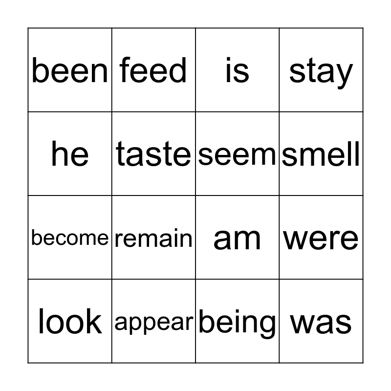 This bingo card has 19 words: am, are, is, was, were, he, being, been, feed, become, remain, taste, seem, appear, look, sound, stay, smell and grow.