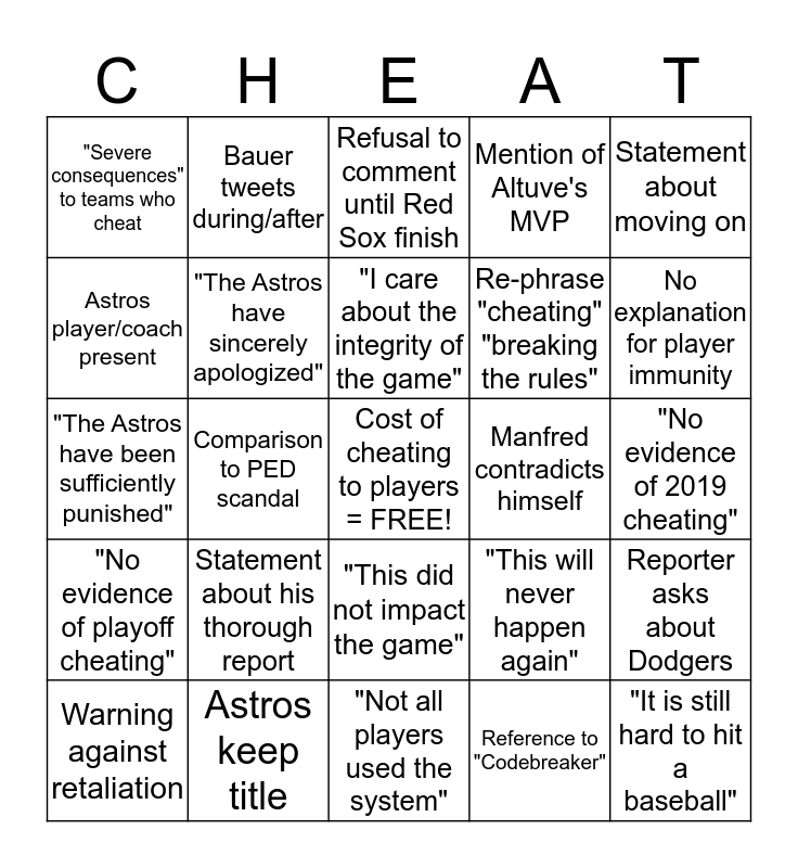 This bingo card has a free space and 24 words: Statement about his thorough report, Astros keep title, "I care about the integrity of the game", Warning against retaliation, Statement about moving on, "Severe consequences" to teams who cheat, Astros player/coach present, Bauer tweets during/after, Manfred contradicts himself, "This did not impact the game", Re-phrase "cheating" "breaking the rules", "The Astros have been sufficiently punished", "This will never happen again", Reporter asks about Dodgers, "The Astros have sincerely apologized", Reference to "Codebreaker", "No evidence of 2019 cheating", Refusal to comment until Red Sox finish, No explanation for player immunity, Comparison to PED scandal, "It is still hard to hit a baseball", "No evidence of playoff cheating", Mention of Altuve's MVP and "Not all players used the system".