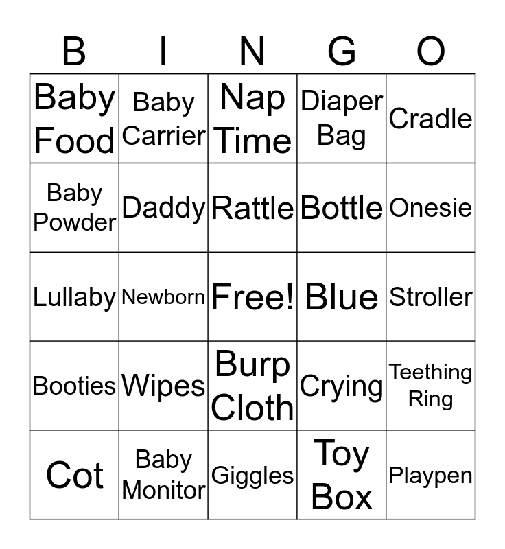 This bingo card has a free space and 45 words: Teether, Playpen, Teddy Bear, Cot, Mobiles, Toy Box, Nap Time, Rubber duck, Cradle, Baby Monitor, Diaper Bag, Blue, Burp Cloth, Wipes, Baby Swing, Giggles, Mommy, Lullaby, Diapers, Onesie, Baby Carrier, Baby Hat, Bath Time, Baby Food, Gerber, Stroller, Bib, Sippy Cup, Crying, Booties, Blankets, Teething Ring, Stork, High Chair, Nursery Rhyme, Newborn, Bassinet, Baby Socks, Baby Book, Rattle, Baby Powder, Bottle, Boy, Daddy and Pacifier.