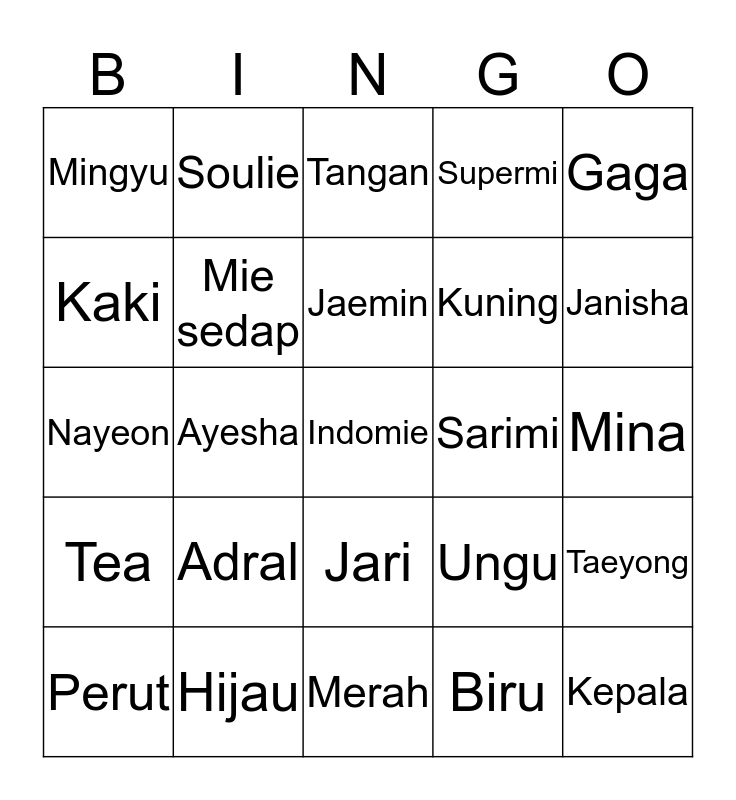 This bingo card has a free space and 24 words: Adral, Hijau, Jaemin, Perut, Gaga, Mingyu, Kaki, Soulie, Sarimi, Jari, Kuning, Nayeon, Ungu, Taeyong, Mie sedap, Biru, Mina, Tangan, Janisha, Ayesha, Kepala, Tea, Supermi and Merah.