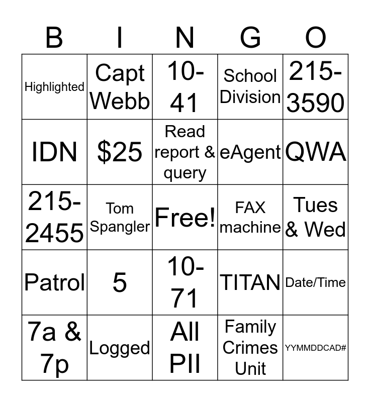This bingo card has a free space and 75 words: 2, Adam Walsh Act, 10-41, Lincoln, None unlike on TV, Cathy, Repo Company, National Crime Information Center, NIA Capias, 3, TIBRS, Shelli & John, Read report & query, IDN, Sign In Sheet, Tom Spangler, Support Services Unit, YYMMDDCAD#, Conditional Release, 215-3590, TN0470000, 215-2455, $25, Capt Webb, School Division, Bernie Lyon, Expungement, GO 1-006, Serial Number, Supervisor, 2 hours, Immediately, Hillary & Martha, TITAN, QWA, eAgent, ADSI, OPS, Tues & Wed, Family Crimes Unit, Phone number & schedule, $0.15/page, $15, Batch Reporting, 215-2444, Police Training, 7a & 7p, Highlighted, 4 or D, Suzanne's, 10 mins, 10-71, Ocean, Never, Confidential, No One Knows, Blue, Multiple Times a Day, SMTs, Purple, 5, Alphabetically by last name, Burning or Shredding, Huey, Depends, FAX machine, Dress Code, Teleserve, Protection Order, Date/Time, Patrol, Logged, HR, All PII and AT#.