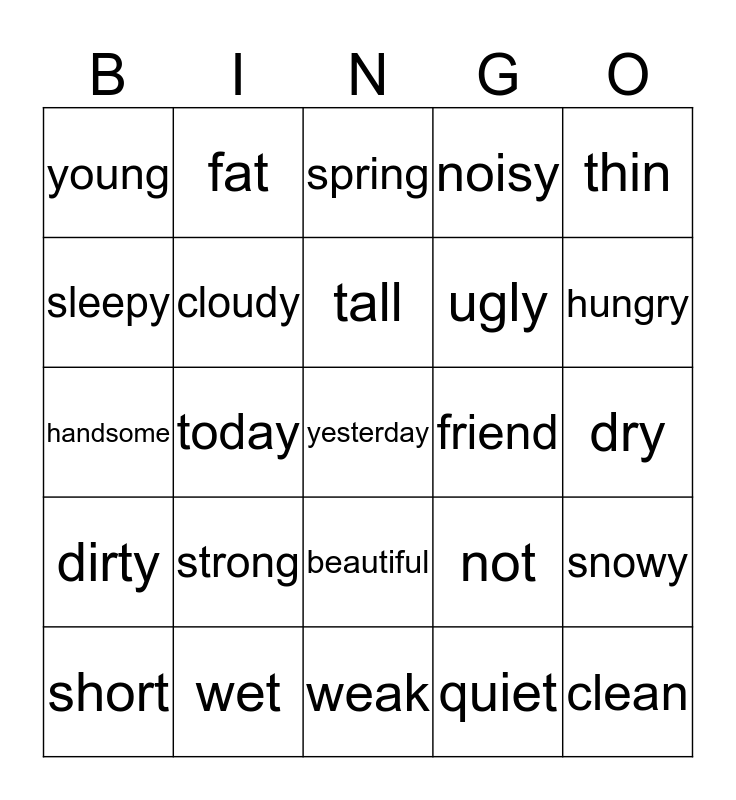 This bingo card has 25 words: strong, weak, tall, short, thin, young, sleepy, fat, friend, beautiful, ugly, handsome, not, snowy, cloudy, clean, dry, spring, hungry, today, yesterday, wet, dirty, noisy and quiet.