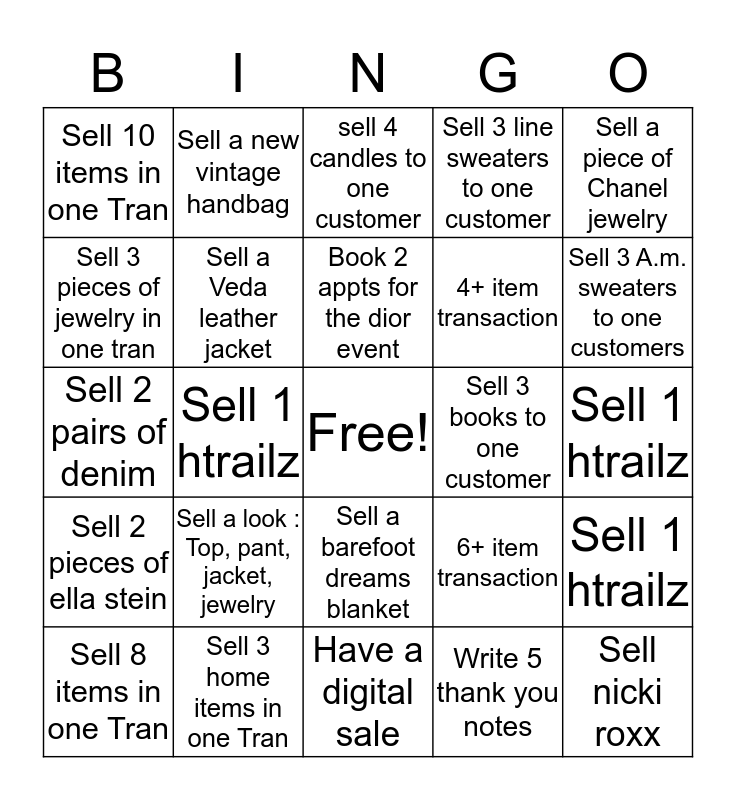 This bingo card has a free space and 24 words: Sell a look : Top, pant, jacket, jewelry, Sell 3 home items in one Tran, Book 2 appts for the dior event, Sell 8 items in one Tran, Sell a piece of Chanel jewelry, Sell 10 items in one Tran, Sell 3 pieces of jewelry in one tran, Sell a new vintage handbag, Sell 3 books to one customer, Sell a barefoot dreams blanket, 4+ item transaction, Sell 2 pairs of denim, 6+ item transaction, Sell 1 htrailz, Sell a Veda leather jacket, Write 5 thank you notes, Sell 1 htrailz, sell 4 candles to one customer, Sell 3 A.m. sweaters to one customers, Sell 1 htrailz, Sell nicki roxx, Sell 2 pieces of ella stein, Sell 3 line sweaters to one customer and Have a digital sale.