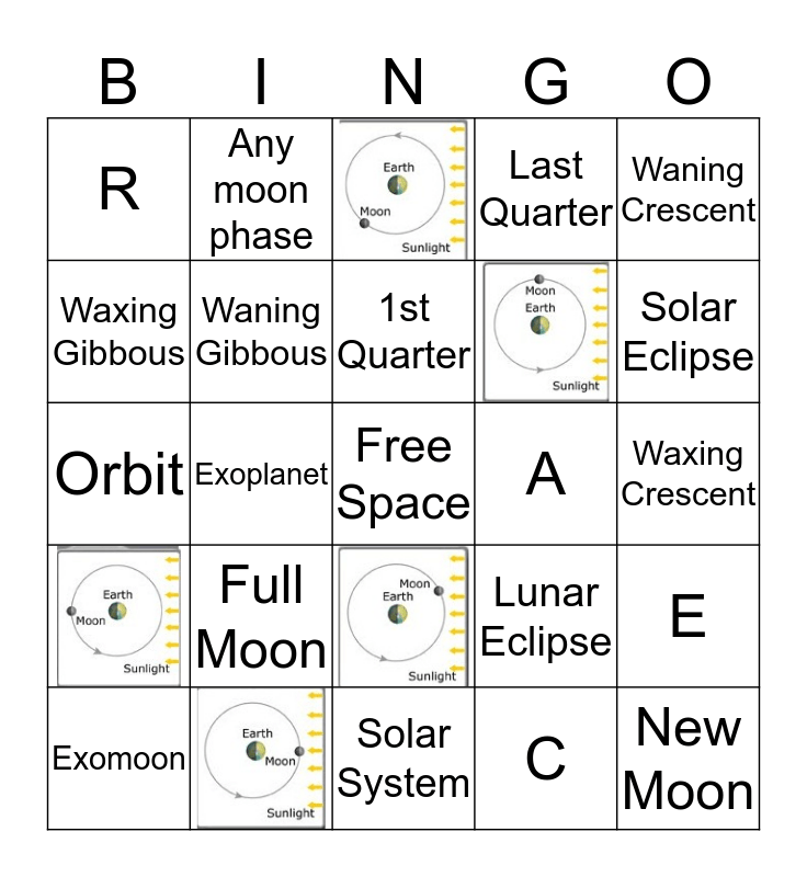 This bingo card has 5 images, a free space and 19 words: Full Moon, 1st Quarter, Exomoon, Waning Crescent, R, Waxing Gibbous, Any moon phase, A, Orbit, Lunar Eclipse, E, Waning Gibbous, C, Waxing Crescent, Solar Eclipse, Exoplanet, New Moon, Last Quarter and Solar System.