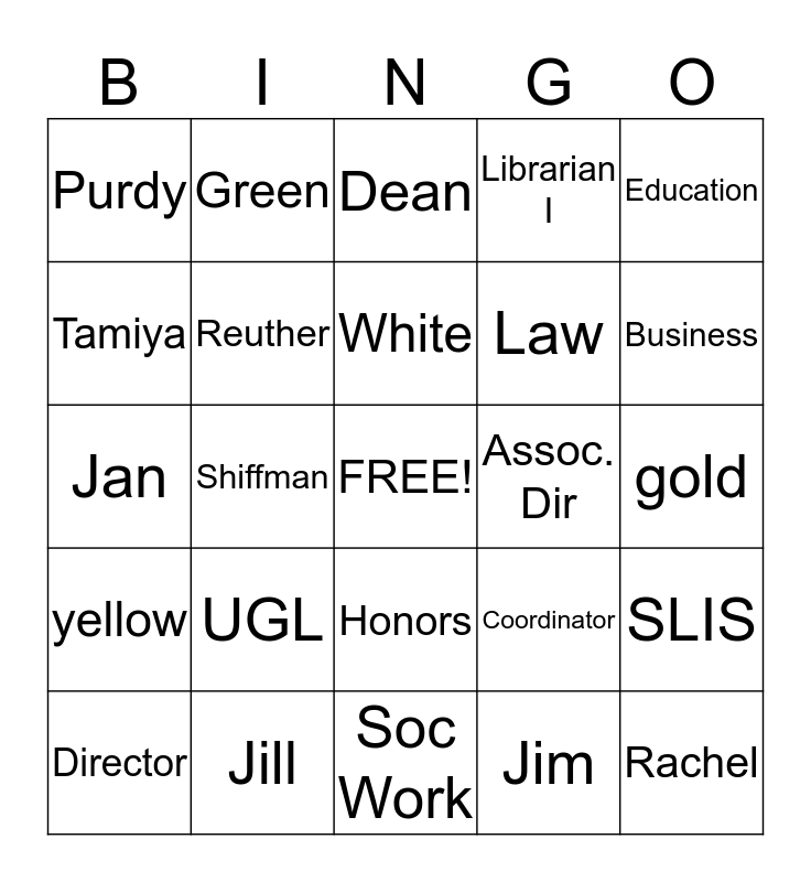 This bingo card has a free space and 24 words: UGL, Jill, White, Director, Education, Purdy, Tamiya, Green, Assoc. Dir, Honors, Law, Jan, Coordinator, SLIS, Reuther, Jim, gold, Dean, Business, Shiffman, Rachel, yellow, Librarian I and Soc Work.
