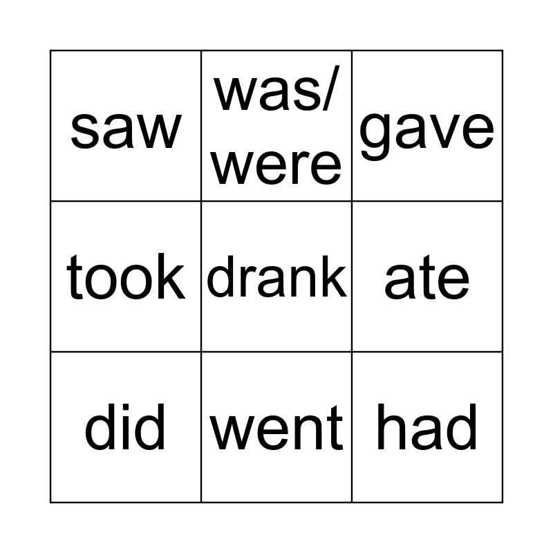 This bingo card has 9 words: did, gave, was/ were, took, saw, ate, drank, had and went.