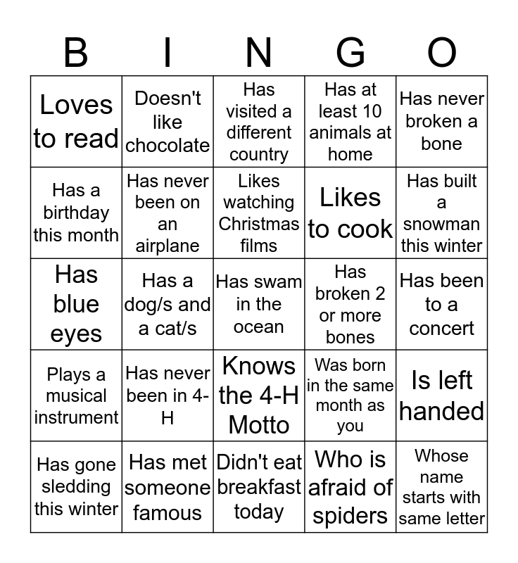 This bingo card has 25 words: Plays a musical instrument, Has met someone famous, Has swam in the ocean, Who is afraid of spiders, Has never broken a bone, Loves to read, Doesn't like chocolate, Has visited a different country, Has broken 2 or more bones, Is left handed, Has a birthday this month, Has never been on an airplane, Didn't eat breakfast today, Was born in the same month as you, Has built a snowman this winter, Has gone sledding this winter, Has a dog/s and a cat/s, Likes watching Christmas films, Likes to cook, Has been to a concert, Has blue eyes, Has never been in 4-H, Knows the 4-H Motto, Has at least 10 animals at home and Whose name starts with same letter.