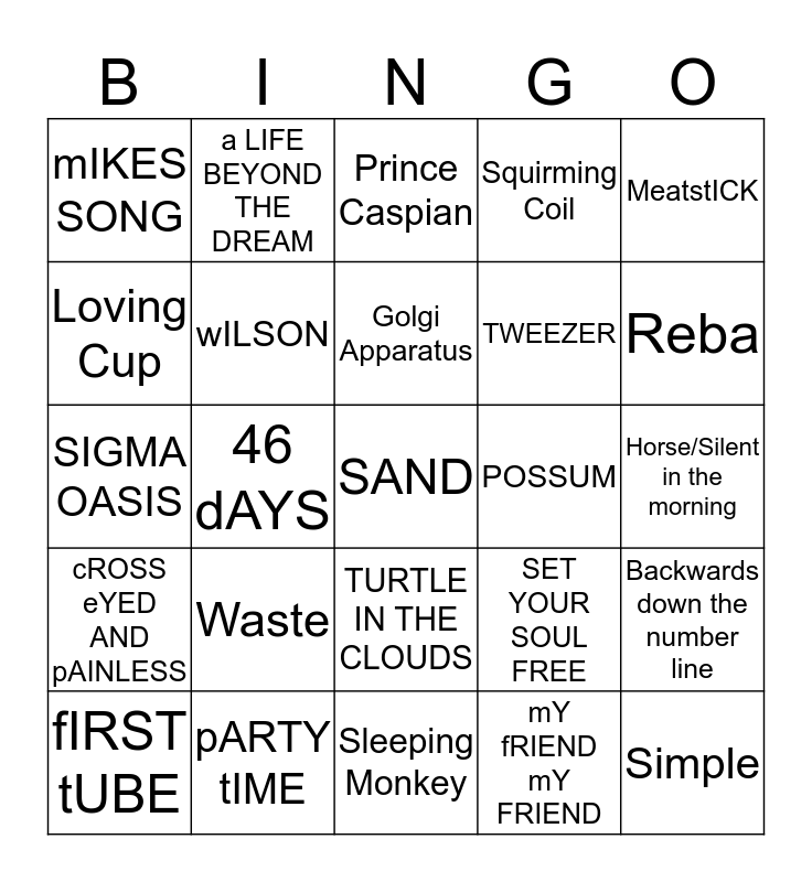 This bingo card has a free space and 24 words: Waste, pARTY tIME, Golgi Apparatus, fIRST tUBE, MeatstICK, mIKES SONG, Loving Cup, a LIFE BEYOND THE DREAM, POSSUM, TURTLE IN THE CLOUDS, TWEEZER, SIGMA OASIS, SET YOUR SOUL FREE, Backwards down the number line, wILSON, mY fRIEND mY FRIEND, Horse/Silent in the morning, Prince Caspian, Reba, 46 dAYS, Simple, cROSS eYED AND pAINLESS, Squirming Coil and Sleeping Monkey.