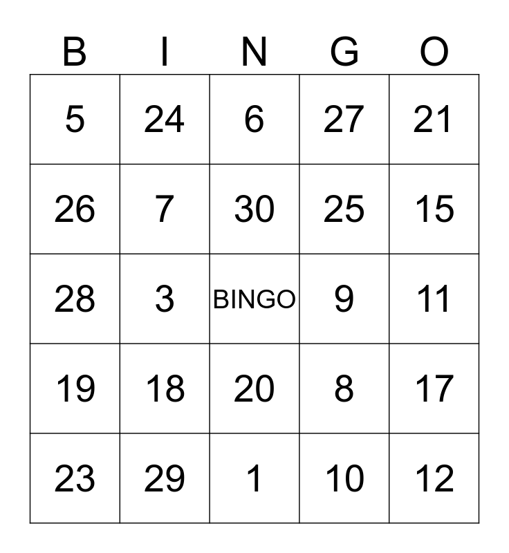 This bingo card has a free space and 31 words: 1, 2, 3, 4, 5, 6, 7, 8, 9, 10, 11, 12, 13, 14, 15, 16, 17, 18, 19, 20, 21, 22, 23, 24, 25, 26, 27, 28, 29, 30 and 31,.