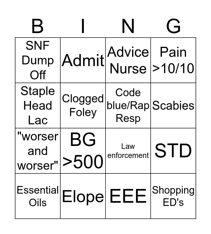 This bingo card has 24 words: Free!, EtOH >300, Scabies, Onset >2 weeks, Staple Head Lac, SNF Dump Off, Clogged Foley, Admit, Elope, Ambulance Transfer, "worser and worser", Law enforcement, LOS >4 hrs, Dental Pain, Code blue/Rap Resp, L&D, EEE, Advice Nurse, BG >500, STD, Essential Oils, Shopping ED's, Pain >10/10 and "feeling sick".