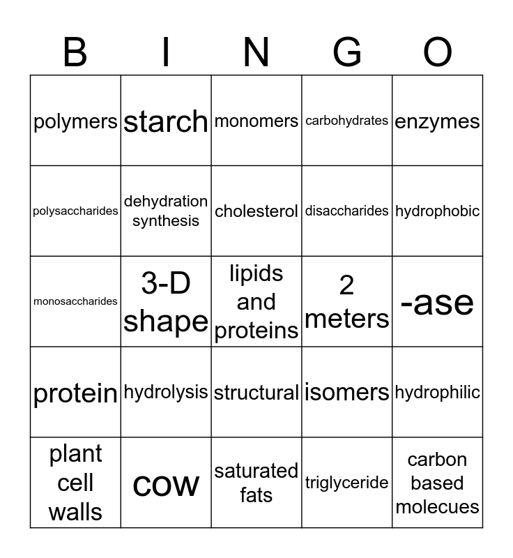 This bingo card has a free space and 29 words: plant cell walls, carbon compounds, 3-D shape, Function, polymers, monomers, dehydration synthesis, hydrolysis, 2 meters, cow, -ase, carbon based molecues, saturated fats, triglyceride, hydrophobic, plants, structural, protein, enzymes, monosaccharides, isomers, activation energy, disaccharides, polysaccharides, carbohydrates, starch, hydrophilic, cholesterol and starch and cellulose.
