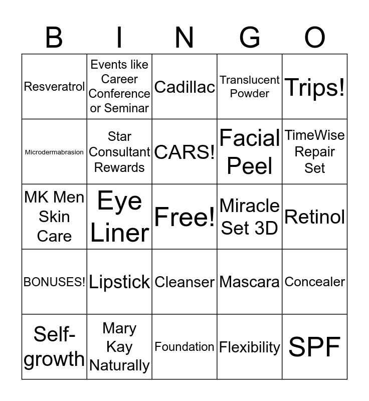 This bingo card has a free space and 34 words: Extra Income, Flexibility, No territories!, Tax deductions, BONUSES!, Star Consultant Rewards, Trips!, Self-growth, Events like Career Conference or Seminar, Profit level, CARS!, Cadillac, Girlfriend time, Access to SPA quality products @ 1/2 price, Miracle Set 3D, TimeWise Repair Set, Mary Kay Naturally, MK Men Skin Care, Lipstick, Mascara, Cleanser, Moisturizer, Resveratrol, Retinol, Foundation, SPF, Translucent Powder, Charcoal Mask, Facial Peel, Microdermabrasion, Eye Shadow, Eye Liner, Concealer and Hydrogel Eye Patches.