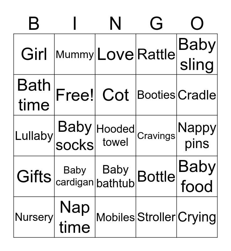 This bingo card has 83 words: Sippy cup, Baby walker, Love, Nappies, Baby shampoo, Wash cloth, Pink, Ultrasound, Baby carrier, Mittens, Shanice, Nursery rhyme, Free!, Cravings, Grandson, Girl, Nursery, Bath time, Toddler, Baby powder, Blue, Booties, Hooded towel, High chair, Baby socks, Dummy, Moses basket, Teether, Granddaugther, Muslin cloth, Baby cardigan, Onesie, Carrycot, Lullaby, Crying, Colic, Mobiles, Stork, Cradle, Gifts, Milk, Baby, Nappy bag, Dolly, Formula, Towel, Mummy, Newborn, Baby book, Play gym, Bottle, Rattle, Nappy pins, Playpen, Wipes, Bib, Blankie, Sleeping Bag, Nap time, Teething ring, Boy, Playsuit, Rubber duck, Baby sling, Clothes, Baby food, Giggles, Family, Baby monitor, Baby lotion, Baby swing, Toy box, Bassinet, Baby bathtub, Stroller, Pram suit, Grandchild, Cot, Teddy bear, Bonnet, Bouncy seat, Baby hat and Blankets.