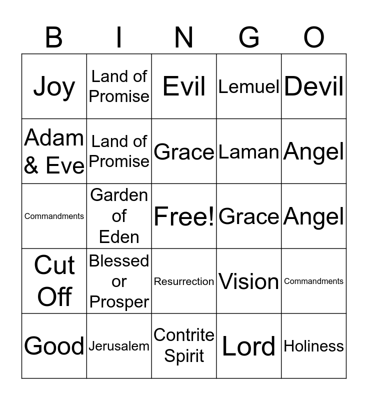 ⚠ This card has duplicate items: Vision (2), Jerusalem (2), Lehi (2), Commandments (2), Lord (2), Hearts (2), Land of Promise (2), Jacob (2), Grace (2), Truth (2), Resurrection (2), Opposition (2), Angel (2), Devil (2), Misery (4), Adam & Eve (2), Garden of Eden (2), Joy (2), Joseph (2), Laman (2), Blessed or Prosper (2), Cut Off (2), Lemuel (2), Redeemer (2), Evil (2), Contrite Spirit (2), Righteousness (2), Wickedness (2), Holiness (2), Good (2), Bad (2)