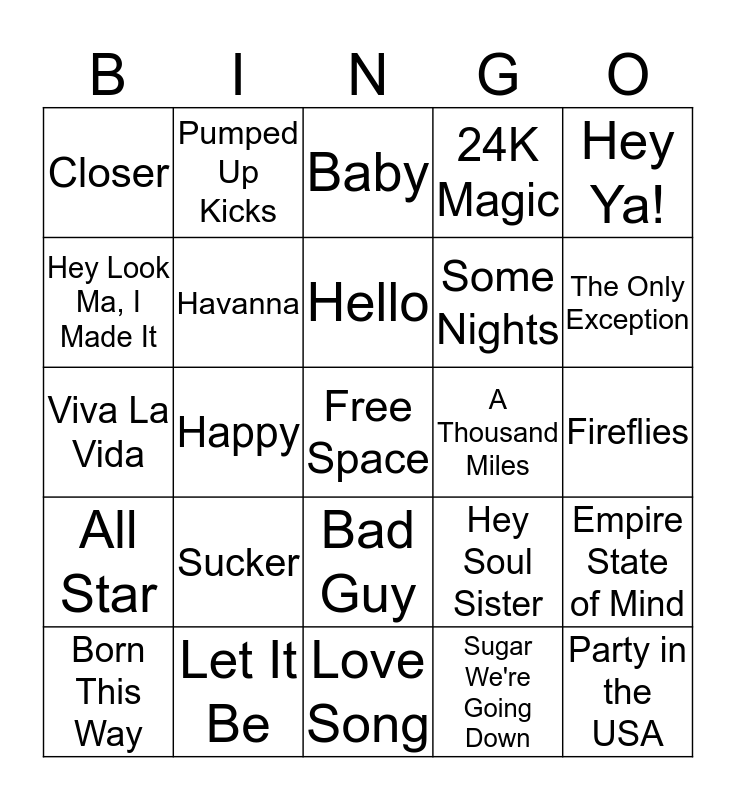 This bingo card has a free space and 24 words: Sucker, Let It Be, Hello, Born This Way, Hey Ya!, Closer, Hey Look Ma, I Made It, Pumped Up Kicks, A Thousand Miles, Bad Guy, Some Nights, Viva La Vida, Hey Soul Sister, Empire State of Mind, Havanna, Sugar We're Going Down, Fireflies, Baby, The Only Exception, Happy, Party in the USA, All Star, 24K Magic and Love Song.