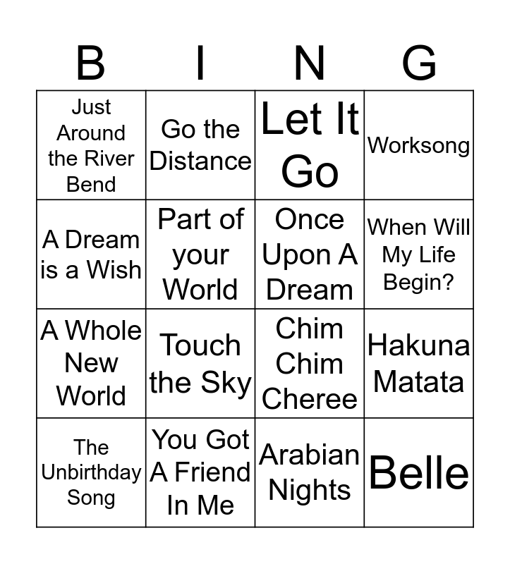 This bingo card has 22 words: You Got A Friend In Me, Reflection, Go the Distance, Can You Feel the Love Tonight, Part of your World, Once Upon A Dream, Just Around the River Bend, Let It Go, Chim Chim Cheree, Belle, A Whole New World, Worksong, I'm Wishing, For the First Time in Forever, Arabian Nights, Colors of the Wind, Hakuna Matata, The Unbirthday Song, Touch the Sky, A Dream is a Wish, When Will My Life Begin? and Almost There.