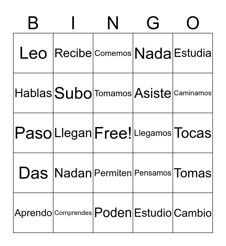 This bingo card has a free space and 24 words: Nadan, Comprendes, Tomamos, Aprendo, Estudia, Leo, Hablas, Recibe, Llegamos, Permiten, Asiste, Paso, Pensamos, Tomas, Subo, Estudio, Tocas, Comemos, Caminamos, Llegan, Cambio, Das, Nada and Poden.