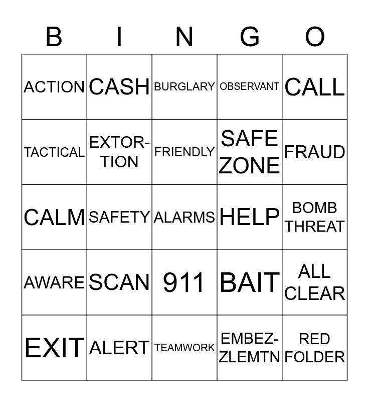 This bingo card has a free space and 24 words: SCAN, ALERT, FRIENDLY, EXIT, CALL, ACTION, TACTICAL, CASH, HELP, 911, SAFE ZONE, CALM, BAIT, ALL CLEAR, EXTOR-TION, EMBEZ-ZLEMTN, BOMB THREAT, BURGLARY, FRAUD, SAFETY, RED FOLDER, AWARE, OBSERVANT and TEAMWORK.