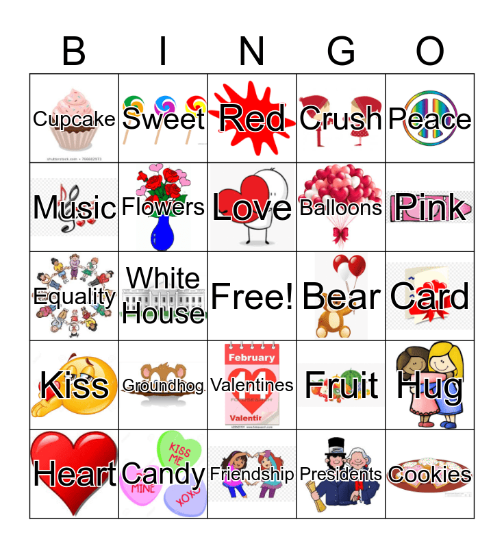 This bingo card has 29 images, a free space and 29 words: Heart, Chocolate, White House, Winter, Cupcake, Red, Flowers, Groundhog, Bear, Candy, Card, Cookies, Friendship, Presidents, Pink, Spring, Valentines, Kiss, Peace, Equality, Fruit, MLK, Balloons, Music, Crush, Sweet, Hug, Love and Rosa Parks.