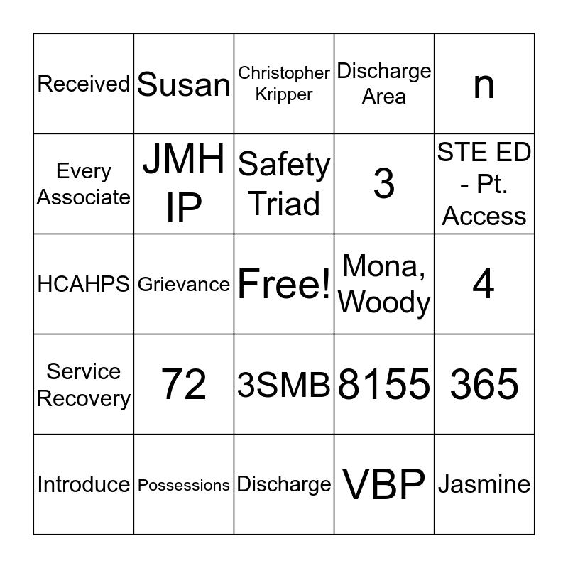This bingo card has a free space and 25 words: 72, Discharge, Safety Triad, Introduce, n, Received, Every Associate, Susan, Mona, Woody, 3SMB, 3, HCAHPS, 8155, 365, JMH IP, Patient Experience Council, 4, Christopher Kripper, STE ED - Pt. Access, Grievance, Jasmine, Possessions, Service Recovery, Discharge Area and VBP.