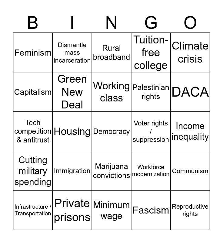 This bingo card has a free space and 47 words: Impeachment, Reproductive rights, Medicare for all, Minimum wage, Immigration, Universal Basic Income, Dismantle mass incarceration, Imperialism / Colonialism, Capitalism, Cut off by a moderator, Green New Deal, Tuition-free college, Communism, Workforce modernization, Electoral college, Reparations, Working class, Voter rights / suppression, Transgender, Climate crisis, Housing, Fascism, Feminism, Palestinian rights, Oil / gas drilling, DACA, Infrastructure / Transportation, Clean water, Marijuana convictions, Cutting military spending, Wall Street taxes, Capital gains taxes, Corporate income taxes, Cash bail reform, Mandatory minimum sentences, Private prisons, Income inequality, Paid family leave, Cancel student debt, Campaign finance, Agribusiness, Rural broadband, Tech competition & antitrust, Refugees / asylum seekers, Abolish ICE, Puerto Rico and Black Live Matter.