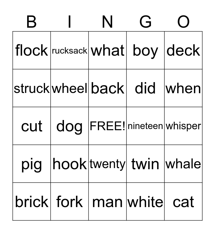 This bingo card has a free space and 24 words: hook, fork, back, brick, deck, flock, struck, rucksack, nineteen, twenty, did, cut, twin, whale, wheel, white, whisper, what, when, dog, cat, pig, boy and man.