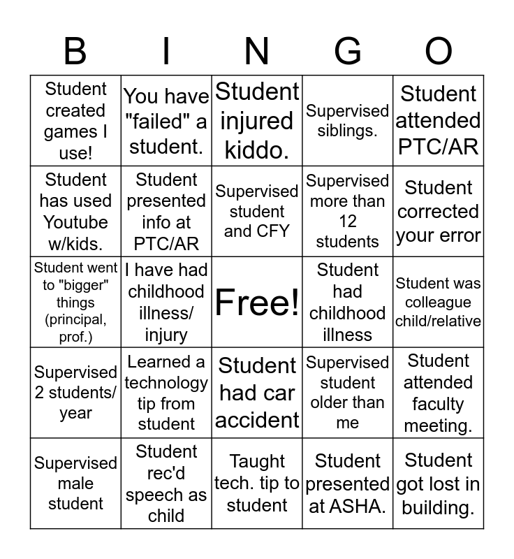 This bingo card has a free space and 24 words: Learned a technology tip from student, Student rec'd speech as child, Supervised student and CFY, Supervised male student, Student attended PTC/AR, Student created games I use!, Student has used Youtube w/kids., You have "failed" a student., Student had childhood illness, Student had car accident, Supervised more than 12 students, Student went to "bigger" things (principal, prof.), Supervised student older than me, Student attended faculty meeting., Student presented info at PTC/AR, Student presented at ASHA., Student was colleague child/relative, Student injured kiddo., Student corrected your error, I have had childhood illness/ injury, Student got lost in building., Supervised 2 students/ year, Supervised siblings. and Taught tech. tip to student.