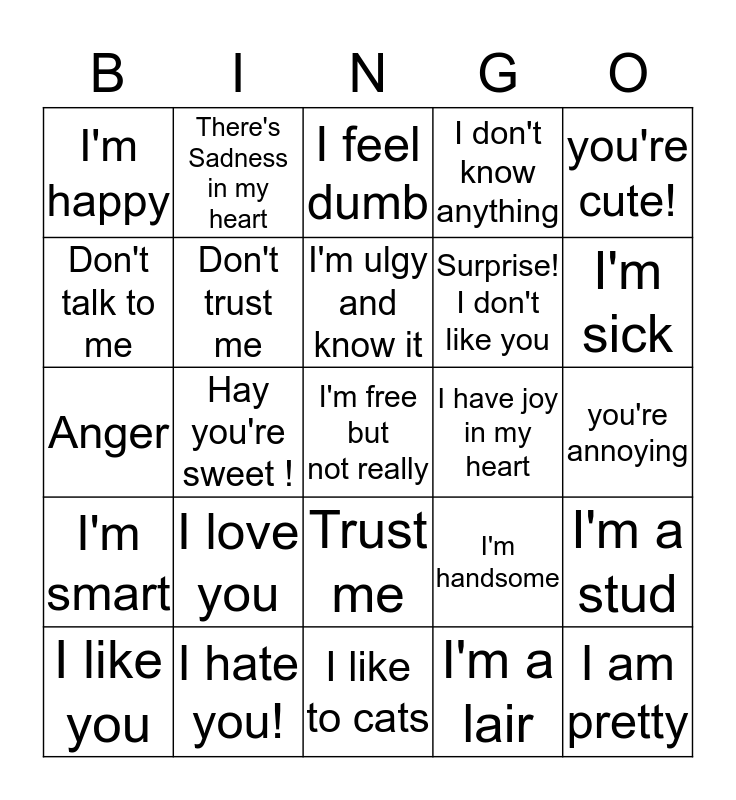 This bingo card has a free space and 24 words: I love you, I hate you!, I'm ulgy and know it, I like you, you're cute!, I'm happy, Don't talk to me, There's Sadness in my heart, I have joy in my heart, Trust me, Surprise! I don't like you, Anger, I'm handsome, I'm a stud, Don't trust me, I'm a lair, you're annoying, I feel dumb, I'm sick, Hay you're sweet !, I am pretty, I'm smart, I don't know anything and I like to cats.