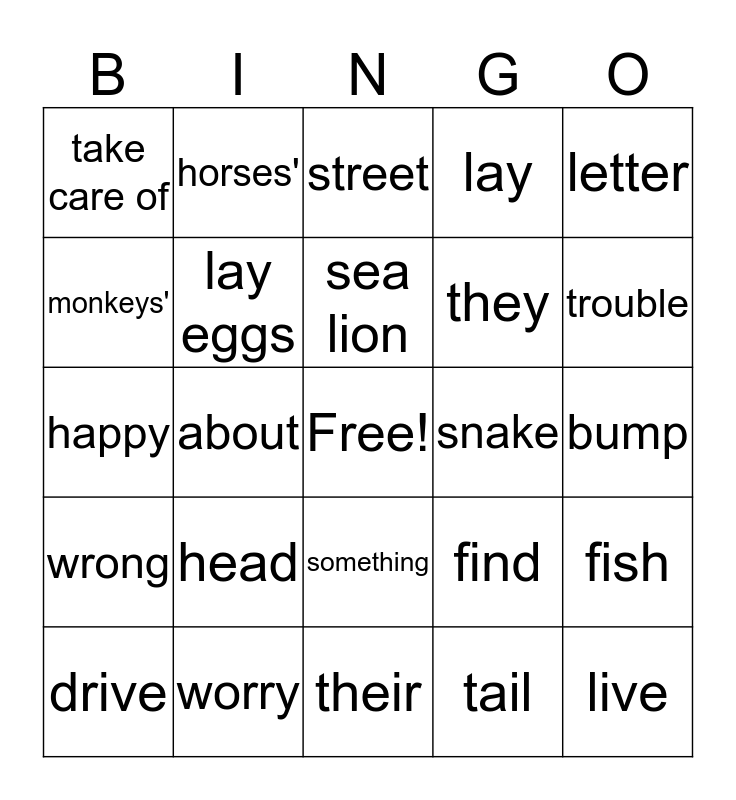 This bingo card has a free space and 48 words: seahorse, live, sea, their, head, look like, horses', horse, monkeys', monkey, lay eggs, lay, fish, find, now, parents, sea lion, snake, listen, letter, about, tail, take care of, they, Mr., trouble, drive, tractor, something, wrong, sorry, truck, Oh my!, digger, worry, okay, friend, bump, thump, lucky, trouble-making, driver, street, puppy, happy, right, hamster and float.