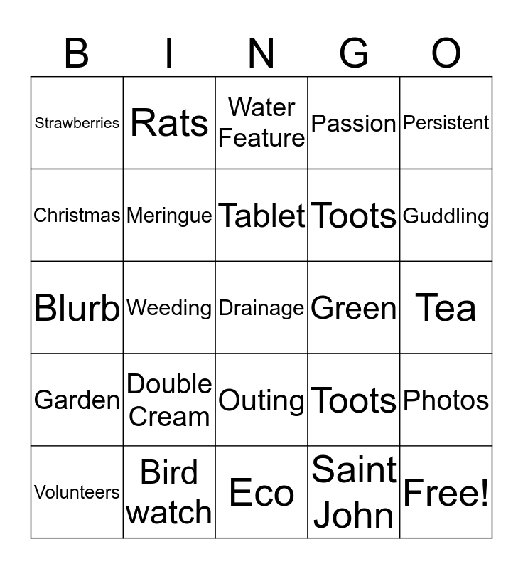 This bingo card has 27 words: Toots, Free!, Toots, Eco, Christmas, Water Feature, Rats, Garden, Green, Photos, Blurb, Passion, Volunteers, Bird watch, Guddling, Chocolate Cake, Meringue, Tablet, Double Cream, Strawberries, Tea, Saint John, Weeding, Drainage, Outing, Persistent and Legend.