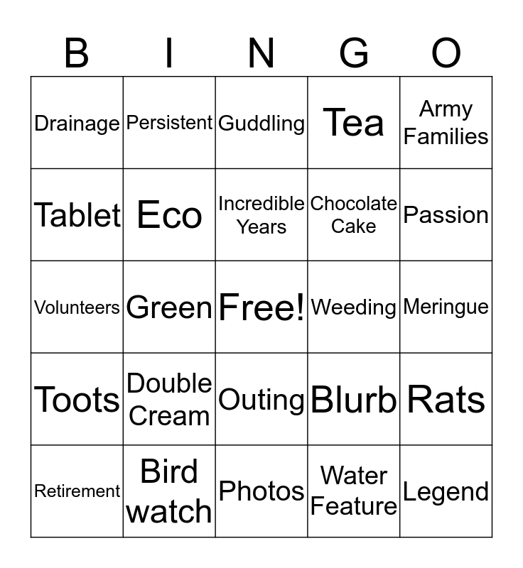 This bingo card has a free space and 30 words: Retirement, Sticky Toffee Pudding, Incredible Years, Caring, Army Families, Drainage, Persistent, Outing, Weeding, Legend, Toots, Eco, Christmas, Water Feature, Rats, Garden, Green, Photos, Blurb, Passion, Volunteers, Bird watch, Guddling, Chocolate Cake, Meringue, Tablet, Double Cream, Strawberries, Tea and Saint John.