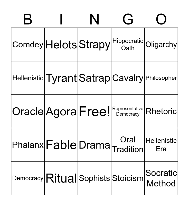 This bingo card has a free space and 33 words: Peninsula, Colony, Agora, Polis, Phalanx, Tyrant, Oligarchy, Democracy, Helots, Ephors, Satrap, Strapy, Zoroastrianism, Direct Democracy, Representative Democracy, Philosopher, Ritual, Oracle, Fable, Oral Tradition, Drama, Tragedy, Comdey, Rhetoric, Sophists, Socratic Method, Hippocratic Oath, Cavalry, Hellenistic, Hellenistic Era, Epicureanism, Stoicism and Myth.